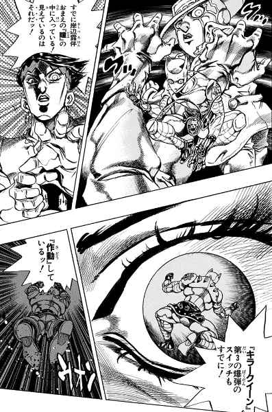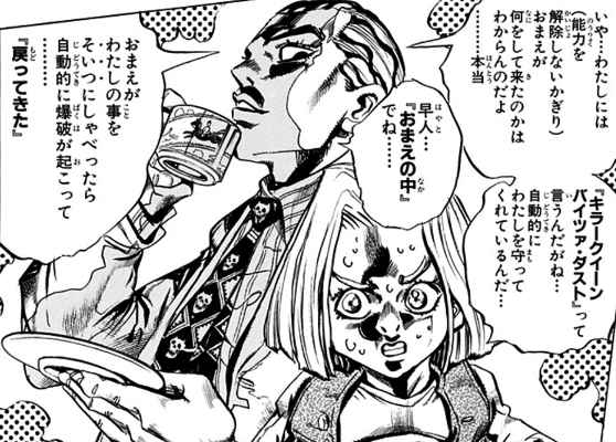 そしてバイツァ・ダストの能力は、杜王町の大地に溜め込まれた「怨霊のエネルギー」を、キラークイーンが引き出し爆発させることで発動する。