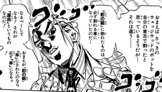 そしてもし依り代が「繰り返される爆殺」を止めたいのであれば、何らかの手段で吉良吉影に能力を解除させるか、彼を殺すしかない。そうすればその時点で爆殺などの「運命の力場」は本来の弱々しい力場に戻り、前回起こった爆殺も再演されることはなくなる。