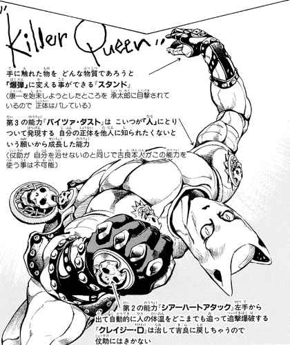 吉良吉影が持つ「爆発を起こすスタンド能力」は、彼が生まれ持った「高い創造性の才能」と、「それを抑圧する家庭環境での成長」から生み出されたものである。これらによってキラークイーンの両手には「抑圧された創造性のエネルギー」が溜まり、さらに創造へと昇華されないそれは未練を残した「怨霊のエネルギー」へと変化している。そしてスタンドの手で他の物体に触れると、この「怨霊のエネルギー」がその物体に流れ込み、解放されることで爆発を起こすのである。