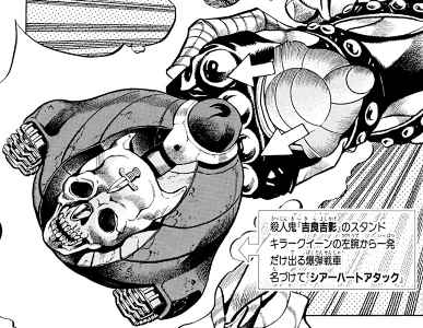 さらにその結果、超硬度に固まった左手の甲の塊、それを作る「怨霊のエネルギー」は、その内に凶暴な意識を目覚めさせ、スタンドの左手を離れて自動的に人間を襲う力を得ている。この塊は吉良吉影によって「シアーハートアタック」と名付けられ、「キラークイーン第2の爆弾」として利用されている。