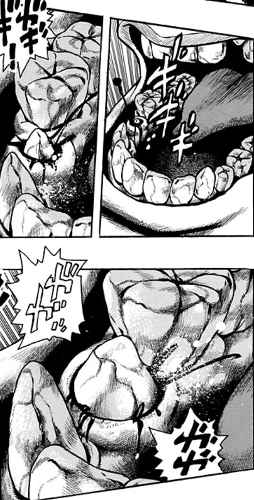 そして分子サイズとなったパール・ジャムは、肉を破棄したければそれに噛みつき咀嚼して垢へと変え、歯などの硬い部位を破棄したければ全員で持ち上げて吹き飛ばし、その後に運んできた料理の成分や周囲の肉体内の成分を資材にして肉体の再生を開始する。分子サイズのパール・ジャムが持つ複雑な腕による再生作業は、パワフルかつ迅速かつ精密であり、再生された肉体部分は見た目に歪なところもなく、既存の肉体部分に完全に馴染んでいる。