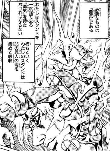 この能力で次に必要なものは、「極罪を犯した36名以上の魂」である。罪人の魂には強いパワーが宿る。そして朽ちていくザ・ワールド(または力を呼び戻されたDIOの骨)が「新しいもの」として復活した体を得るには、罪人36名以上のパワーが必要なわけである。