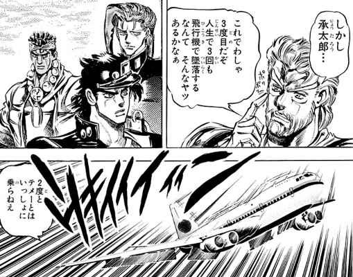さらにDIOを倒した後の3部ラストでは、空港でジョセフと承太郎がポルナレフと別れ、直後2人は快復したホリィが待つ日本へ飛行機で帰ったわけだが、まさかその飛行機が墜落したなどということもないだろう。