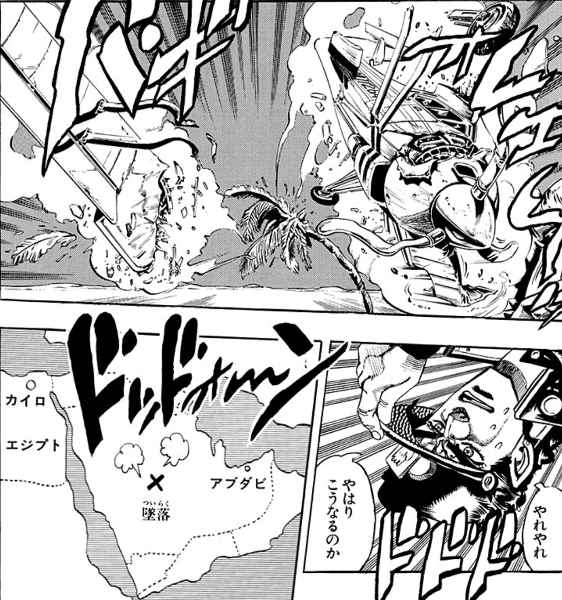 その後ジョースター一行はほぼ陸路と海路でエジプトに向かうが、途中一度だけ砂漠をショートカットするためセスナ機を利用した。その時も予定を聞かされた時点で承太郎は懸念を示し、そして実際セスナ機は(敵スタンド使いの攻撃の影響で)墜落してしまった。