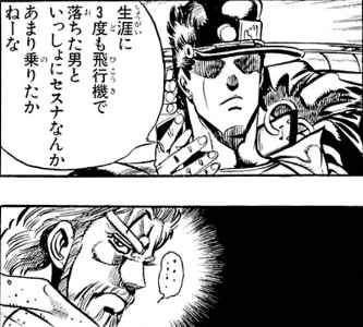 このように「ジョセフが乗った飛行機は危ない」というのは、ジョセフがうっかりつぶやいた過去の話を針小棒大に盛った濡れ衣である。そして承太郎も内心ではそれをわかった上で、雑談でのたわいのない冗談としてそう言っているに過ぎない。