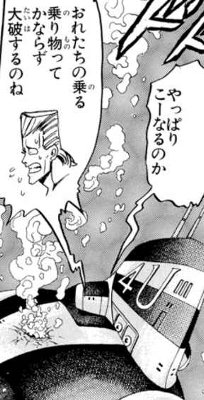 ちなみにジョセフの言うこれまでの生涯での2度の墜落は、まず彼が13歳のとき、スピードワゴンの自家用機がハイジャックされて紆余曲折の末墜落したのが1度目。次は18歳のとき、2部の最終決戦で究極生命体になった柱の男カーズからドイツ軍の軍用機で逃げ、飛んで追ってきたカーズの攻撃で落とされたのが2度目である。