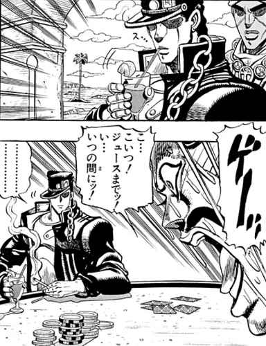 なおダービー戦のジュースの時もそうであるが、承太郎は自分の身に起こった明らかに不自然な幸運を、疑問なく受け入れる傾向がある。この理由は彼が、生まれてからずっと不自然な強運を体験してきた結果、自分の益となる不自然な現象はもう深く考えないよう心に染み付いているからなのであるが、ここでは詳しくは触れない。
