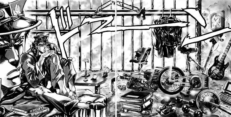 空条承太郎は、ジョジョの奇妙な冒険第3部「スターダストクルセイダース」の主人公であり、スタンド「スタープラチナ」の本体である。そしてスタープラチナは、承太郎がそれを制御できていなかった3部序盤に、承太郎のいる留置場の牢屋内に、どこからか勝手に承太郎の望む物、例えばビール、ラジカセ、オカルト書、ギター、バーベルなどを運び込んでいた。