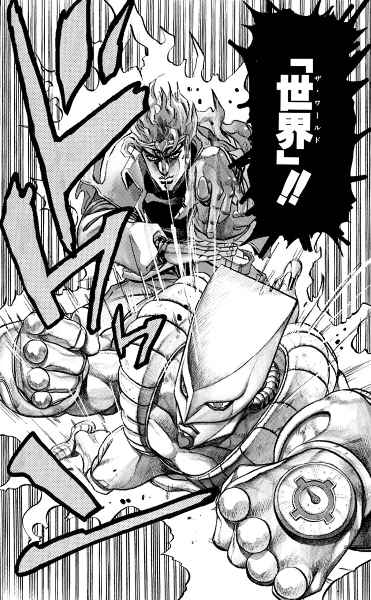 ちなみにDIOの右腕であったエンヤ婆は3部序盤に、DIOに「スタンドとは守護霊のこと」「あなたの守護霊はとてつもない力を持っている」と語っていたが、これは「神の力」を背後に宿すザ・ワールドの性質をよく言い当てている。