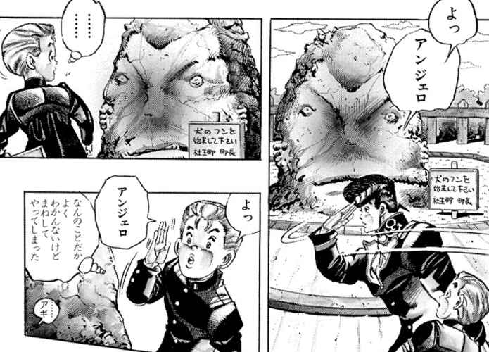東方仗助がスタンド「クレイジー・ダイヤモンド」の能力で、祖父を殺した凶悪殺人犯アンジェロ(本名片桐安十郎)を岩に叩き込み一体化させて作り出した人面岩。岩の中の魂は半覚醒状態で生きており、たまにちょっと喋る。