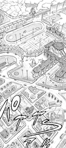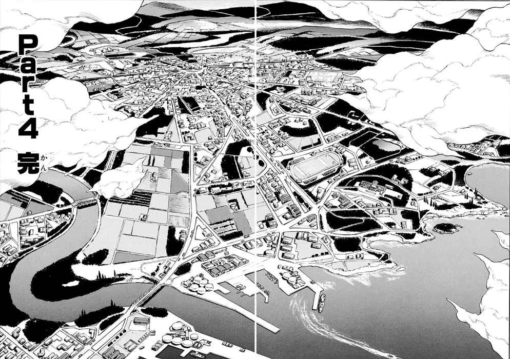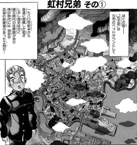 9話「虹村兄弟 その1」1ページ目に描かれた、杜王町全体を上空から見た俯瞰図。作中で最初に杜王町の全体像が示された絵である。