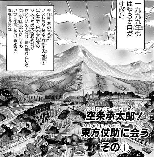 4部1話の1ページ目に描かれた、杜王駅辺りの俯瞰図。4部中盤に描かれた駅前俯瞰図2と比べると、駅前の建造物が明らかに閑散としている。また後の杜王町では駅の北側にも街並みが広がっているのに対して、この時点では線路北がすぐ山になっている。