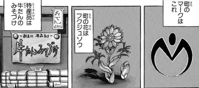 またこの回によると、杜王町の町花はフクジュソウ(福寿草)で、特産品は牛タンの味噌漬け。町のマークはアルファベットの「M」を模している。