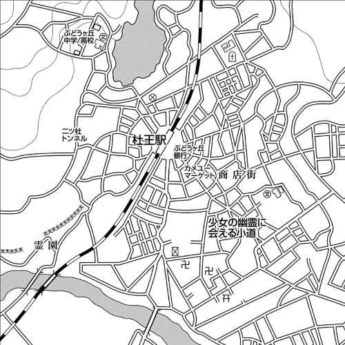 ジョジョ4部が2004年に文庫化された際に、68話「岸辺露伴の冒険 その4」と69話「岸辺露伴の冒険 その5」の間に掲載された地図。杜王駅の南南東、杜王駅と仗助の家のちょうど中間辺りに、「少女の幽霊に会える小道」があるとされている。