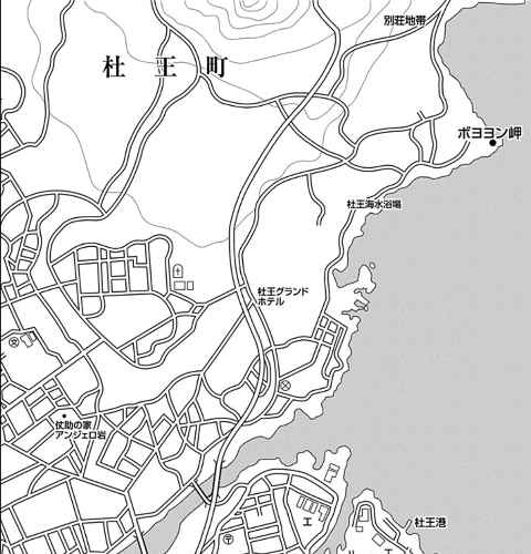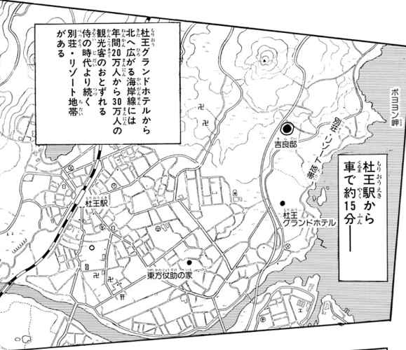 ジョジョ4部文庫版の、100話「アトム・ハート・ファーザー その1」と101話「アトム・ハート・ファーザー その2」の間に掲載された地図。ジャンプコミックス版にはなかった「杜王海水浴場」の場所が示されている。
