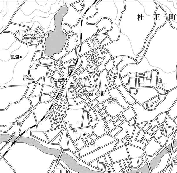 すぐ上の駅前俯瞰図1と比べると、駅の北側にも町が広がり、より栄えた感じになっている。ただ後の地図との大きな違いもあり、例えば駅のすぐ北にある、円形の道路に囲まれた謎の区画は後の地図では無くなっている(これは形状的にもしかすると「ぶどうヶ丘高校」かもしれず、この時点ではこの場所の予定だったのかもしれない)。