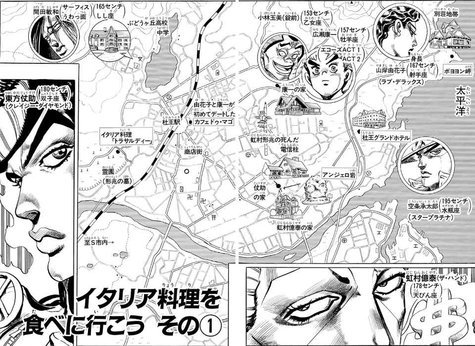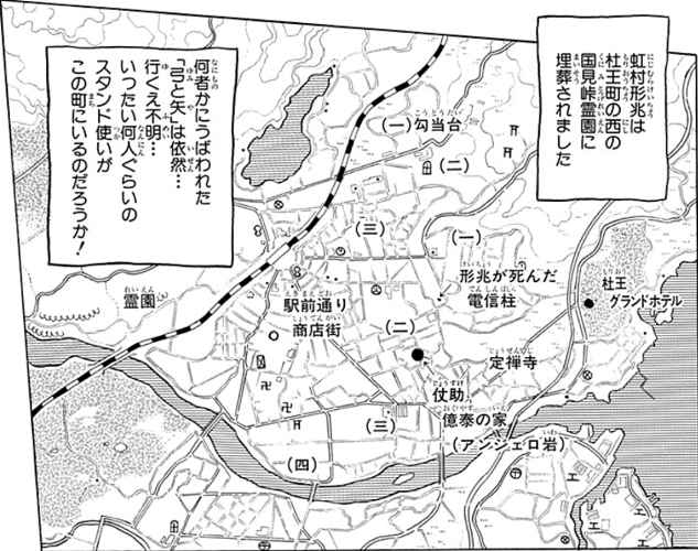 地図上には「東方仗助の家」(すぐ近くの「虹村億泰の家」「アンジェロ岩」も含む)、「虹村形兆が死んだ電信柱」、空条承太郎が滞在している「杜王グランドホテル」、虹村形兆が埋葬された「国見峠霊園」の場所が示されている。