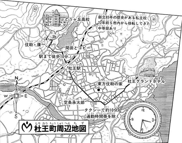 またこの地図では、ぶどうヶ丘高校から杜王駅までは徒歩10分、杜王グランドホテルから杜王駅まではタクシーで約10分(通勤時間帯を除く)とされ、その道のりも示されている。