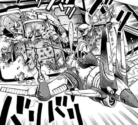 ナランチャがエアロスミスを引っ込める手順は、この問題を解決するためにある。人間にとって、自分の背中からうなじ、後頭部にかけての背面は、最も意識が及びにくい部位である。そしてそれが理由でスタンド使いは、自分の意思で操作するスタンドが自分の背面間近にある時、スタンドの力が弱まる。