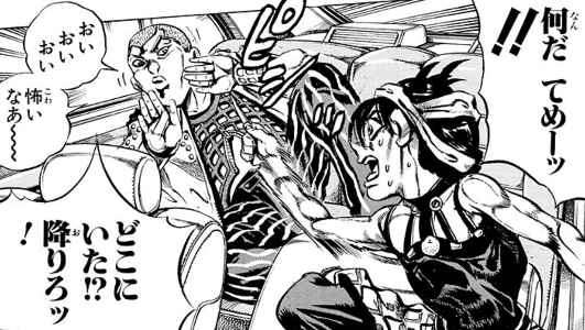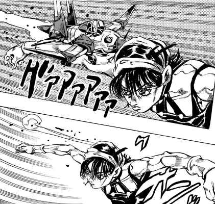 ところでナランチャはエアロスミスを引っ込める時に、両腕を滑走路のように開いたポーズを取り、そこにエアロスミスを着陸させるという手順を踏む。これもナランチャのスタンド使いとしての未熟さに由来する。
