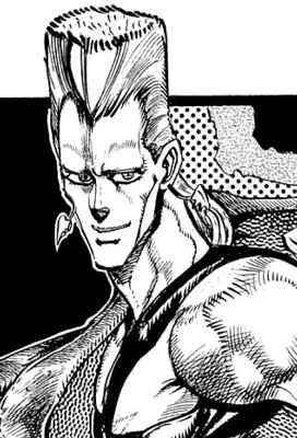 そして彼は、頭髪を真上に垂直に立てて円筒形にまとめた、奇抜な髪型をしていることで有名である(ちなみに3部31話「皇帝と吊られた男 その5」扉絵のプロフィールによると、彼の身長は「185cm(髪を入れると193cm)」だそうである)。