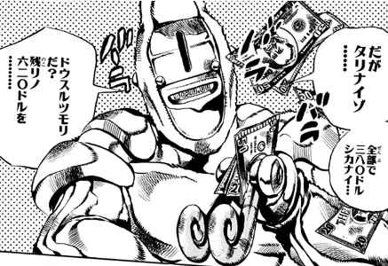 ジョジョ6部に登場するスタンド。本体のミラションと金銭絡みの賭けを始めた相手の影に取り憑き、そこから相手の精神を監視する能力を持つ。そして相手が負けを認めるか、自分の心に恥じるイカサマをしたりすると、相手の影から姿を現して、相手の財貨を取り立て始める。
