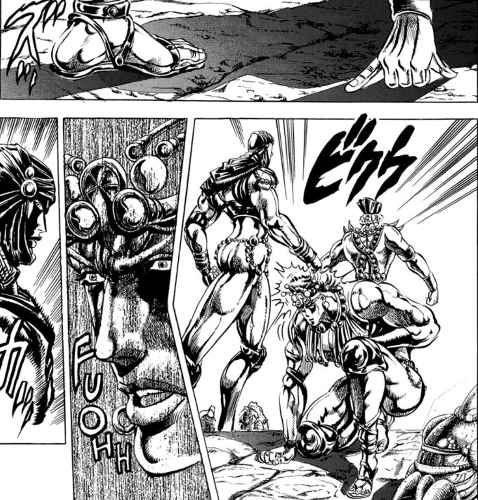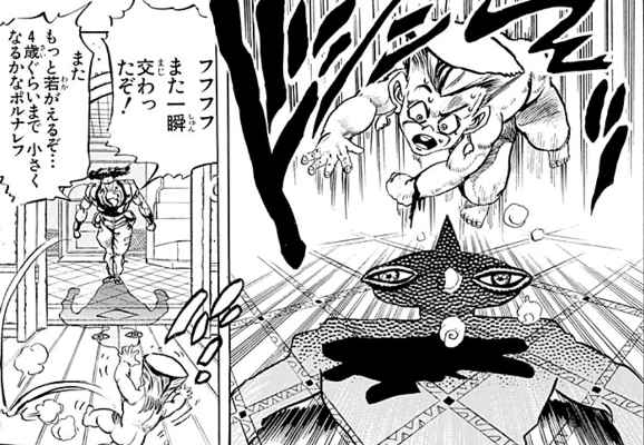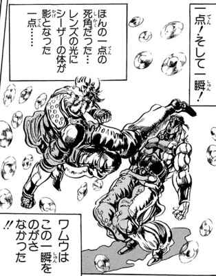 また余談になるが、ワムウは後のシーザー・ツェペリとの戦いで、シーザーの影を物理的に利用してシーザーに逆転勝利している。つまりここでのワムウは相手の影を「相手の急所」として利用したわけである。