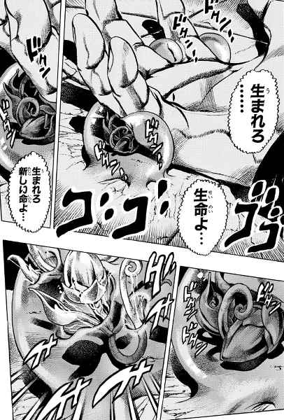 次いでジョルノの前髪に話を移す。これもここでは詳しく解説しないが、ジョルノの前髪に与えられた寓意は「創造」である。彼にこの寓意が与えられている理由は言うまでもなく、彼のスタンド「ゴールド・エクスペリエンス」が生命を創造する能力を持つからである。