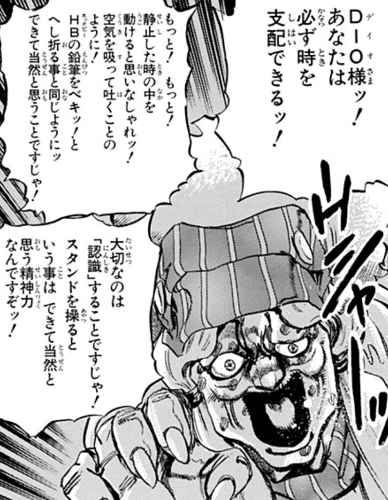 エンヤ婆が語ったルールは、その心理的な枷を外す心構えを示すものである。そうしてDIOは「止まった時の中で動くこと」を当たり前と思うことで、能力を完全に目覚めさせ、さらにその持続時間を伸ばしていけたわけである。