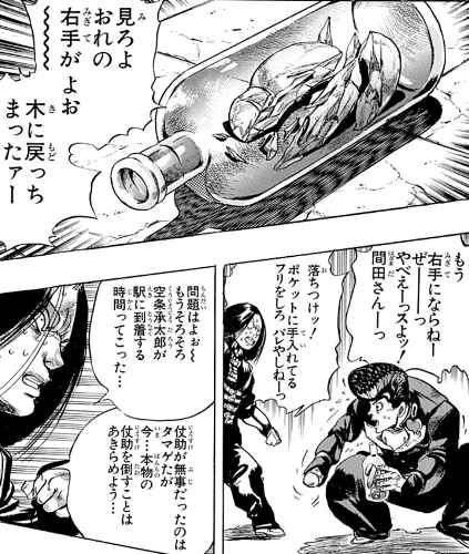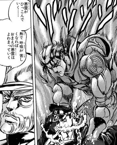 初出は3部3話「悪霊 その正体!」。承太郎の呼吸が、モハメド・アヴドゥルのスタンド「マジシャンズレッド」が生み出す炎で妨げられ、承太郎のスタンドが引っ込んでいく際にジョセフが語ったルール。