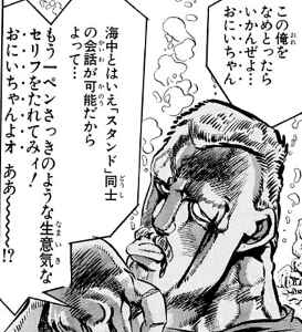 初出は3部16話「暗青の月 その3」。スタンド「ダークブルームーン」の本体である偽テニール船長と承太郎が海中に落ち、水中戦を始める前に偽船長が語ったルール。