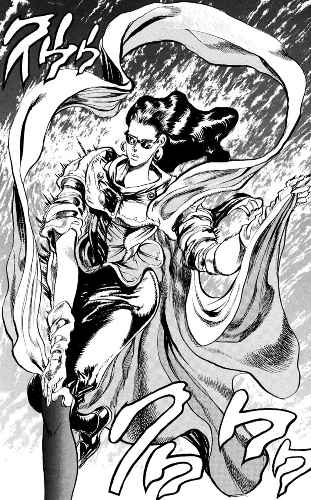 また彼女は戦いでは、首に巻いた「マフラー」を波紋を流す武器として好んで使う。これは彼女が生み出す激流のような波紋パワーが、彼女自身の手足よりも自在に動く布の中のほうが本領を発揮できるからである。そして彼女のマフラーは時に天女の羽衣のように流麗に、時に蛇の鎌首のように力強く舞い動く。